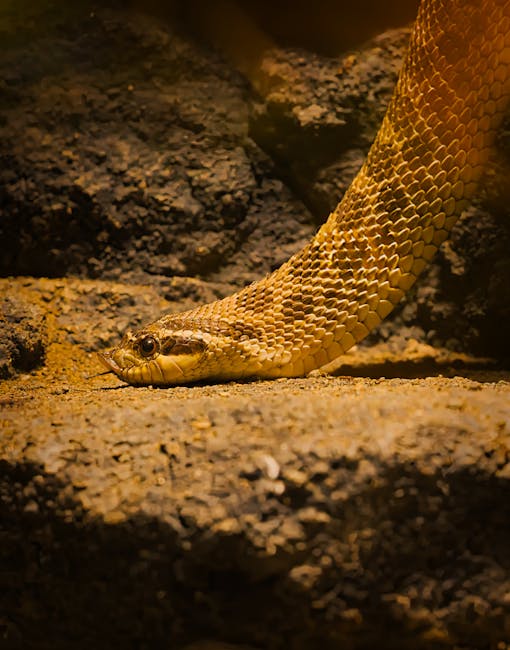 Close-up of a golden snake slithering on rocky terrain in its natural habitat.