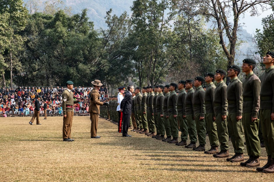 Gurkha soldiers participating in an official military parade in Pokhara, Nepal.