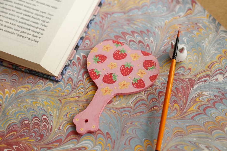 Artistic flat lay featuring a book, paintbrush, and patterned paddle amidst marbled paper.