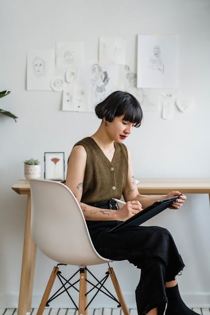 A young woman artist sketching on a tablet in a modern office setting, surrounded by artwork. Creative and focused atmosphere.